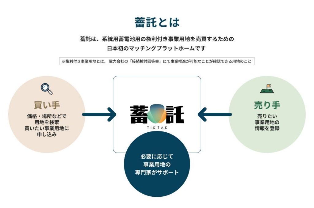 系統用蓄電池事業に特化した用地売買・マッチングプラットフォーム「蓄託(TIK TAK/チクタク)」を2025年12月25日にリリースいたしました。