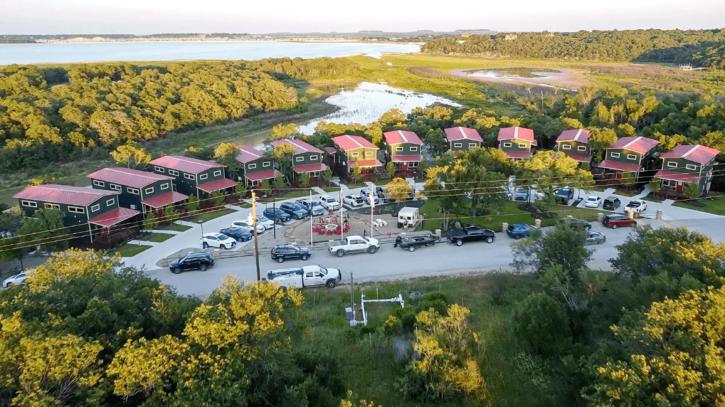 本プロジェクトでは、テキサス州ダラス都市圏から車で約1.5時間に位置する大型湖「Lake Bridgeport」湖畔のキャンプリゾート「Camp QYB」に「Park Model Home」を設置し、宿泊施設として運用します。